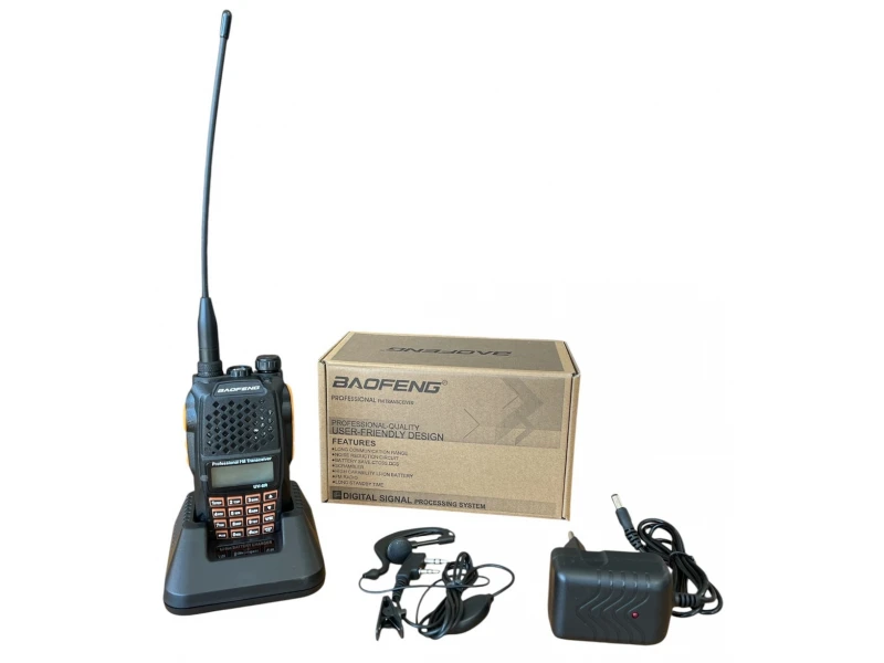 Stația de radio este echipată cu o baterie litiu-ion cu o capacitate de 5000mAh și un încărcător, precum și un sistem hands-free confortabil. Poate fi utilizată într-o gamă largă de temperaturi - de la -30 la +60 de grade. Ușor de utilizat chiar și pentru începători. Este o alegere bună pentru persoanele a căror muncă sau hobby necesită utilizarea unor astfel de dispozitive - vânători, pescari, rulotiști, alpiniști, schiori, radioamatori, șoferi de teren accidentat, agenți de pază, angajați din complexe comerciale sau centre comerciale și alții. Setul include: Stație radio UV-6R (VHF 136-174Mhz UHF 400-520Mhz) Baterie reîncărcabilă Li-ion de 7,4 V și 5000 mAh antenă 136-174/400-520Mhz clemă de curea indicații rutiere încărcător de birou (100V ~ 240V) Căști PTT cu microfon hands-free Caracteristici: interval de frecvență: 136-174 / 400-520 MHz Frecvențe VHF/UHF cu transmisie radio bidirecțională 136-174/400-520Mhz Afișaj cu bandă duală Afișaj cu frecvență duală, Mod standby dual putere de ieșire: 7 W număr de canale: 128 (50 CTCSS și 104 CDCSS) Lanternă LED ecran LCD mare Comutabil putere RF înaltă/scăzută comutare între frecvențe radio înalte și joase 25KHz/12.5KHz Alarmă SOS alarmă de baterie descărcată funcție de economisire a energiei cronometru de expirare blocarea tastaturii Canalul monitorului pas pentru fiecare canal ulterior: 2,5/5/6,25/10/12,5/25KHz ascultarea unui anumit canal ROGER SET