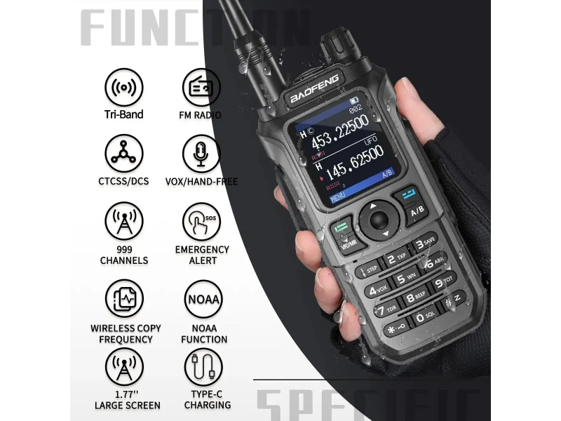 • Dual Band: Capacitatea de a opera simultan pe două frecvențe diferite (VHF/UHF), ceea ce crește eficiența comunicării