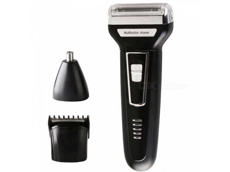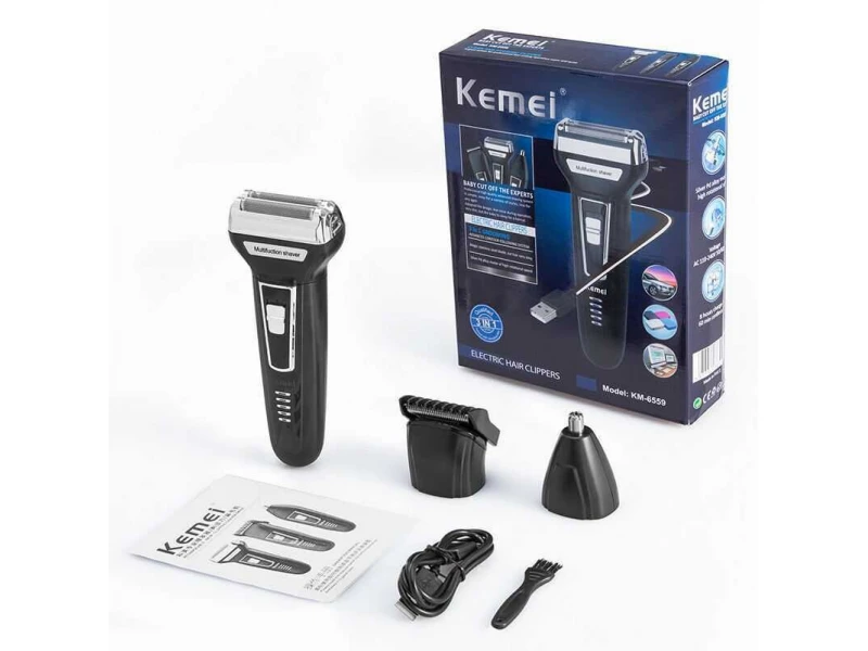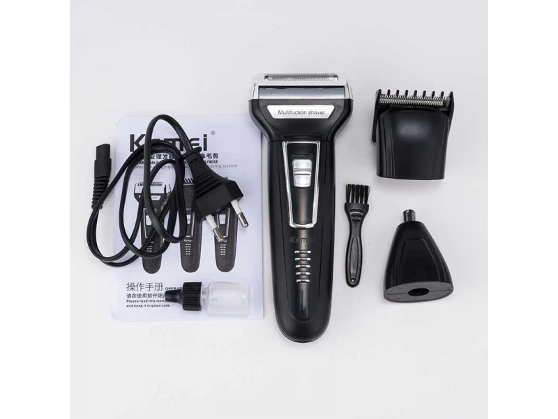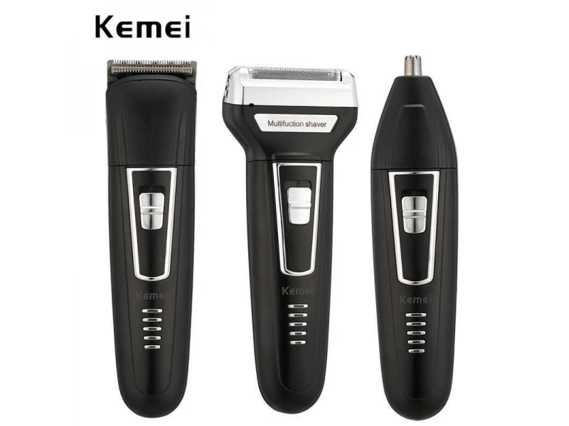 Vă prezentăm aparatul de ras și tuns Kemei KM-6558 pentru bărbați, care are 3 atașamente - ras, tuns și curățare a părului din nas și urechi.
