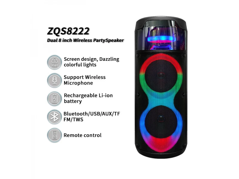 Adăugați distracție și stil oricărei reuniuni de karaoke cu boxa iluminată WVNGR ZQS-8223 . Cu două boxe de 8 inci și un sunet puternic, această boxă este concepută pentru momente de savurare muzicală, fie că sunteți acasă, în grădină sau în aer liber.