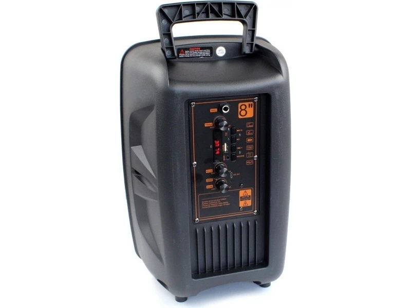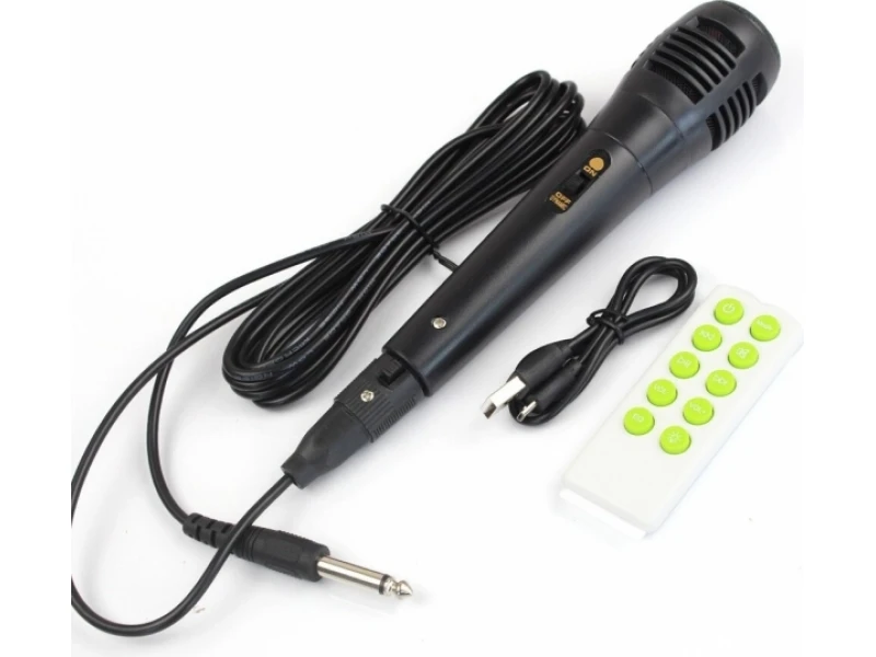 Kitul conține: 1 buc. Boxă karaoke reîncărcabilă 1 buc. Microfon cu fir 1 cablu de alimentare pentru sistem karaoke – 220V 1 buc. Telecomandă. Caracteristici tehnice: Putere: woofer de 8 inch Nivel sonor: 85 dB Frecvență: 100Hz – 20kHz Alimentare: 220V. Specificații: Boxă karaoke cu baterie reîncărcabilă (încărcabilă de la 220V) COLOR MUSIC – efecte de iluminare încorporate, cu comutator pornit/oprit Funcție BLUETOOTH – conectați difuzorul la un GSM, computer, laptop și ascultați muzica preferată fără fir – pe o rază de acțiune de peste 10 metri Tuner FM – RADIO Telecomandă (inclusă) Posibilitatea de utilizare independentă fără conectare la un computer prin: Slot pentru card de memorie SD/MMC/MMS Slot pentru unitate flash USB Intrare AUX de la un dispozitiv extern (computer, GSM, iPod, PSP) AFIȘAJ LED Intrare pentru 1 microfon Microfon cu fir 1 bucată – inclus în set Mâner retractabil convenabil – pentru transportul ușor al difuzorului Dimensiuni: l/î/a – 24 / 36,5 / 20 cm