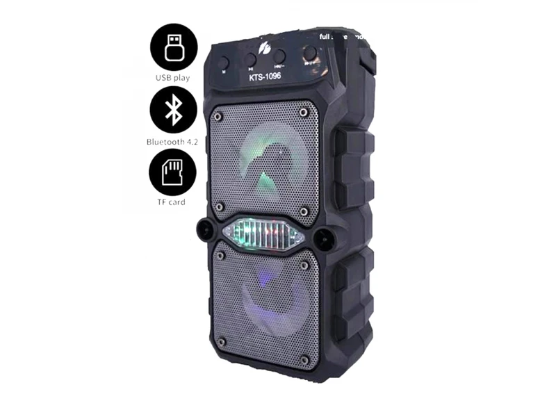 Boxă karaoke KTS 1096 cu tuner FM, telecomandă, funcție BLUETOOTH, microfon, muzică color. Boxa este potrivită pentru petreceri, sărbători, prezentări etc. Este extrem de convenabilă pentru utilizarea în locuri unde nu există electricitate. Caracteristici: 2 difuzoare: 3 inch; Alimentare: 220V; Efecte de iluminare; Bluetooth; Radio; Slot pentru card de memorie SD/MMC/MMS; Slot pentru unitate flash USB; Panou de control; Telecomandă; Baterie reîncărcabilă încorporată: 3,7 V/2400 mAh Setul conține: 1 difuzor karaoke; 1 microfon cu cablu; 1 buc. telecomandă; 1 cablu de încărcare pentru difuzor 220V.