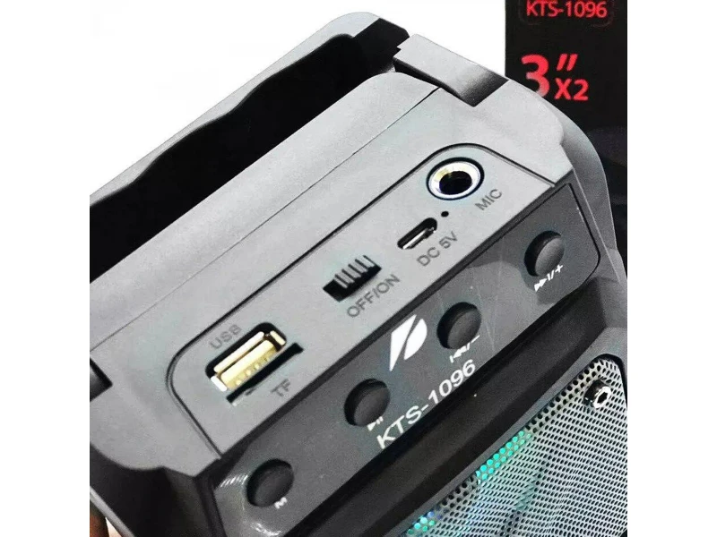 Boxă karaoke KTS 1096 cu tuner FM, telecomandă, funcție BLUETOOTH, microfon, muzică color. Boxa este potrivită pentru petreceri, sărbători, prezentări etc. Este extrem de convenabilă pentru utilizarea în locuri unde nu există electricitate.