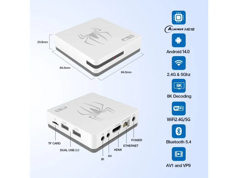- Performanță puternică: Datorită procesorului Allwinner H618 și WiFi 6, experimentați streaming ultra-fluid, încărcare rapidă și jocuri fără latențe.