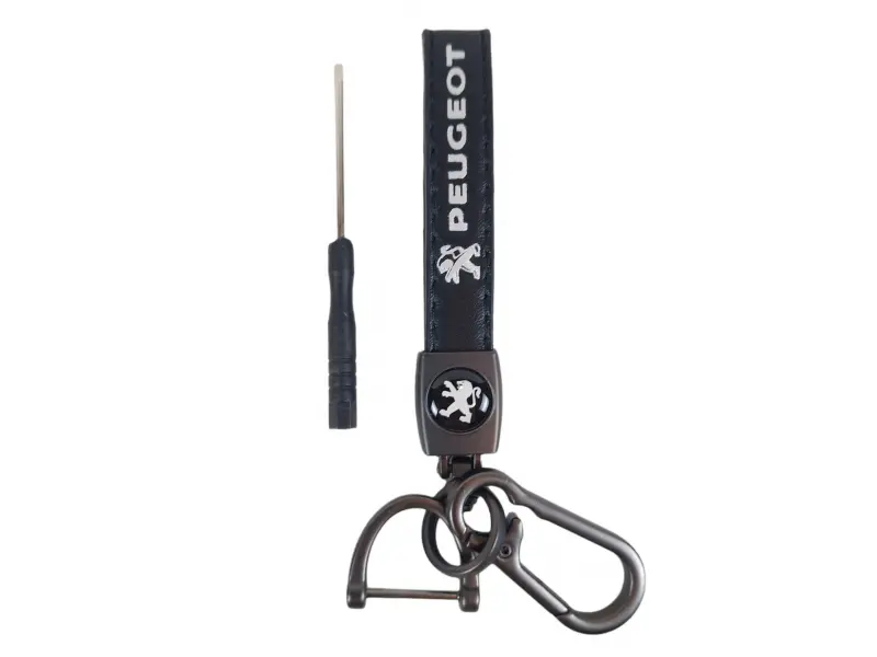 Breloc auto marca Peugeot cu inel și posibilitatea de a fi atașat la curea sau geantă. Decorat cu o curea din piele pentru încheietura mâinii. Cadou ideal pentru fanii și posesorii de mașini Peugeot.