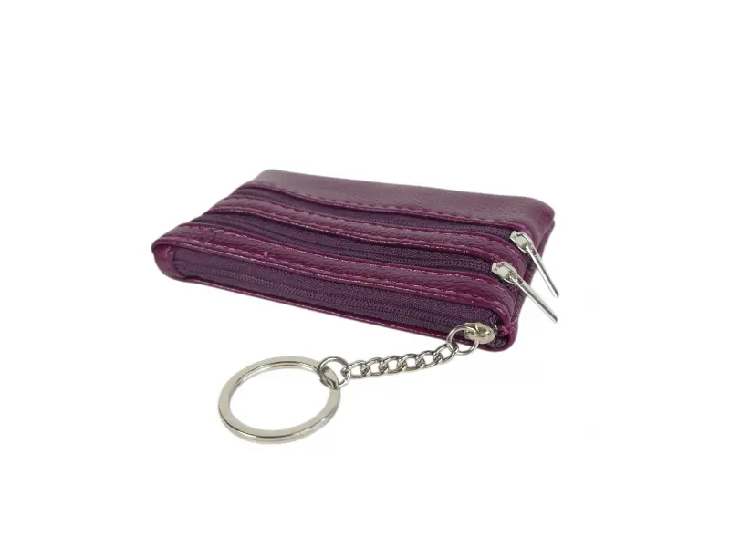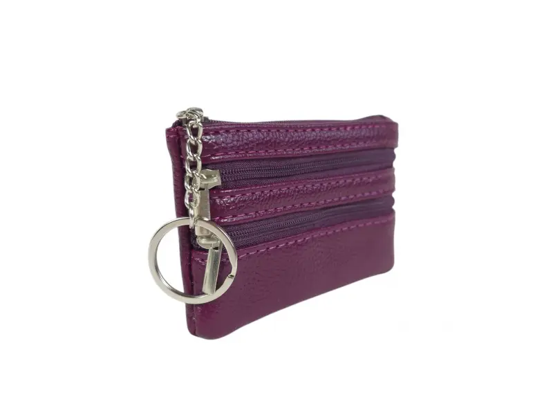 Breloc din piele de culoare violet - Poșetă din piele naturală cu inel de chei. - Compartiment pentru bancnote. - Două compartimente pentru monede. - Inel de chei.