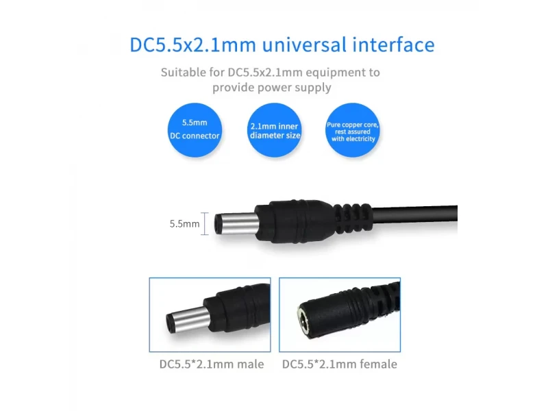Prelungire cablu, mărind distanța dintre priza de alimentare (220V) și dispozitivul alimentat. În acest fel, adaptorul de alimentare poate fi ascuns în interior atunci când obiectul alimentat este instalat în exterior.