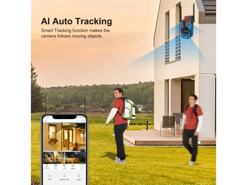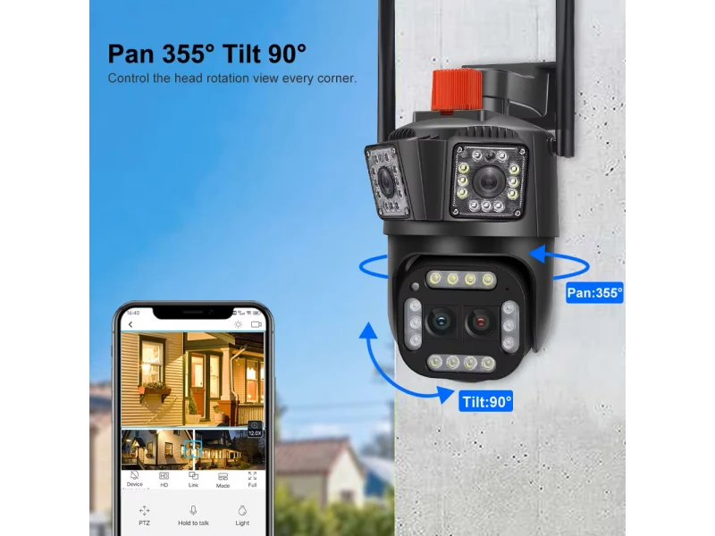 Cameră IP WiFi triplă pentru exterior, 12 MP, cu obiectiv dual, zoom 10×, recunoaștere facială AI, vedere nocturnă, audio bidirecțional, PTZ 320°×110° și protecție IP66.