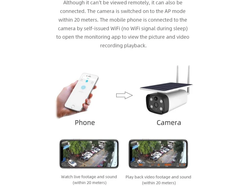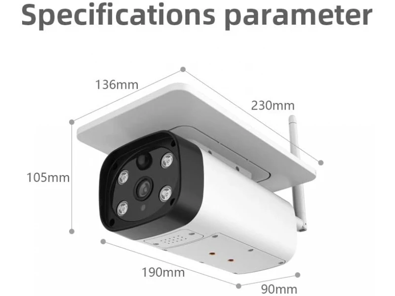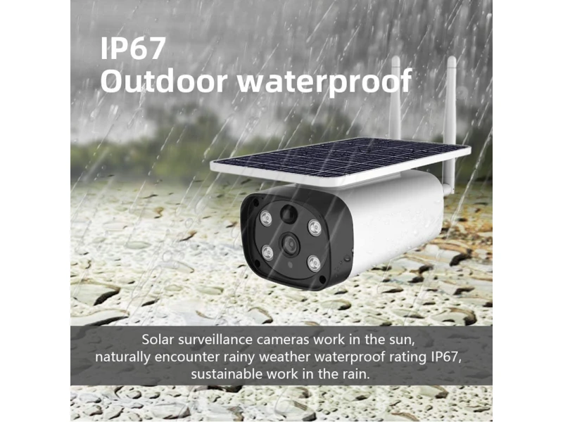 Cameră solară wireless WiFi IP 2MPX 1080P Full HD cu senzor de mișcare PIR cu microfon încorporat, slot pentru card SD de până la 64GB și difuzor pentru conexiune audio bidirecțională. Camera are 2 LED-uri albe 2W LED 1W*2 și 2 LED-uri IR 2W LED 1W*2 pentru supraveghere video nocturnă de până la 60 de metri. Consum extrem de redus de energie și funcție inteligentă de economisire a energiei. Dispozitivul are două moduri de funcționare - standby cu consum de 0,0076W și în modul de lucru ziua - 1,4W, noaptea - 2,4W. Suportă 4 baterii reîncărcabile tip 18650, care se încarcă prin panou solar sau cablu USB. Monitorizare de la distanță în timp real, vizualizare a înregistrărilor și administrare prin dispozitive Android și iOS. Suport pentru instalare ușoară pe tavan sau perete. Carcasă rezistentă la umiditate cu design elegant - IP67. Matrice: senzor CMOS de 1/2,9″ Procesor DSP: Hi3518EV200; ARM926@800MHz Rezoluție: 1080P (1920×1080); Lentilă 4mm (2,8mm-12mm) HMD (Detecția Mișcării Umane) Senzor PIR Flux video: 15 fps – timp real; Compresie: H.264; Interfață de rețea: Wi-Fi; Rețele wireless acceptate: IEEE 802.11 /b /g /an Monitorizare mobilă prin iOS și Android; Aplicație mobilă: APP-I-CAM Unghiul de detectare al senzorului PIR – 120 de grade Slot pentru card de memorie Micro SD cu o capacitate de 64 GB Înregistrare cu detecție de mișcare; Microfon încorporat de înaltă sensibilitate; Difuzor încorporat pentru conexiune audio bidirecțională; Pixeli efectivi: 1920 (Î) x 1080 (V); Sensibilitate minimă la lumină: 0,0001 Lux cu IR oprit și 0,00 Lux cu IR activat; Parametri imagine: BLC, WDR, Viteză obturator, Nivel zi/noapte, Dezaburire, AGC, AE; Viteză obturator: Automată 1/50 1/60 – 1/50000 sec.; Raport semnal-zgomot: > 69dB; Suport 2D pentru montare ușoară pe tavan sau perete; Posibilitatea de rotire a imaginii: DA; Imagine în oglindă: DA; Carcasă impermeabilă de culoare albă – IP67; 2 LED-uri albe 2 LED-uri IR Viziune nocturnă de până la 60 m. Capacitate baterie: 5200mAh (2000mAh) Panou solar Capacitatea bateriei: 52000mAh Energie solară: 2,2 W 400 mA Rezistență la praf și umiditate IP67; Temperatura de funcționare: -10 grade până la 60 grade Dimensiuni: 230 x 105 x 135 mm; Privine este o cameră wireless WIFI solară de ultimă generație FULL HD 2MPX alimentată de un panou solar încorporat. Lentilă de 4 mm (2,8 mm-12 mm) și senzor PIR cu unghi de detecție de până la 120 de grade. Slot pentru card de memorie cu o capacitate maximă de până la 64 GB. Microfon și difuzor de înaltă sensibilitate pentru conexiune audio bidirecțională. Rezistent la apă cu grad de protecție IP67 - rezistent la umezeală și praf. Model extrem de potrivit pentru supravegherea exterioară a curților, barajelor, pășunilor, stupinelor, fermelor, a zonei de intrare din fața casei, a magazinelor și a altor unități comerciale.