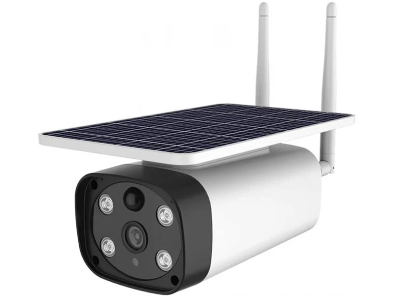 Cameră solară wireless WiFi IP 2MPX 1080P Full HD cu senzor de mișcare PIR cu microfon încorporat, slot pentru card SD de până la 64GB și difuzor pentru conexiune audio bidirecțională. Camera are 2 LED-uri albe 2W LED 1W*2 și 2 LED-uri IR 2W LED 1W*2 pentru supraveghere video nocturnă de până la 60 de metri. Consum extrem de redus de energie și funcție inteligentă de economisire a energiei. Dispozitivul are două moduri de funcționare - standby cu consum de 0,0076W și în modul de lucru ziua - 1,4W, noaptea - 2,4W. Suportă 4 baterii reîncărcabile tip 18650, care se încarcă prin panou solar sau cablu USB. Monitorizare de la distanță în timp real, vizualizare a înregistrărilor și administrare prin dispozitive Android și iOS. Suport pentru instalare ușoară pe tavan sau perete. Carcasă rezistentă la umiditate cu design elegant - IP67.
