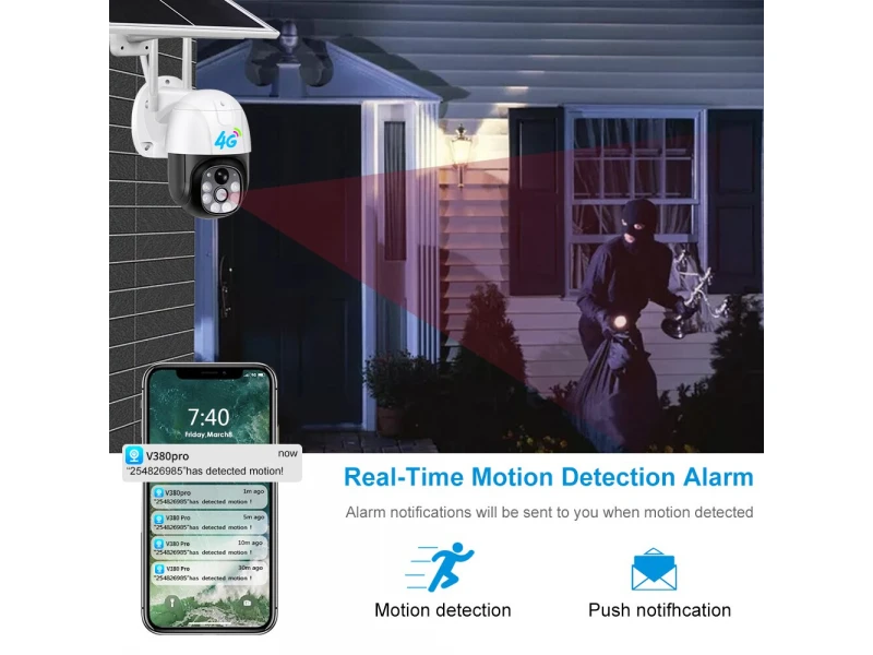 Cameră video de supraveghere solară profesională, alimentată direct de lumina soarelui prin intermediul unui panou solar cu baterii încorporate. Camera este potrivită pentru spații exterioare unde accesul la electricitate este limitat, iar cablajul este nedorit și inutil. Avantaje și caracteristici: Camera funcționează cu o cartelă SIM de la un operator de telefonie mobilă sau prin Wi-Fi. O cameră de 3 megapixeli cu o rezoluție de 1536x2048 asigură o calitate profesională și consistentă a imaginii. Rotația camerei (PTZ) în direcții orizontale și verticale direct prin aplicația mobilă V380 Pro . Monitorizare de la distanță a obiectului protejat prin telefon mobil, tabletă. Rază de acțiune WIFI de la cameră la router - 25 de metri (teren deschis). Carcasă stabilă, rezistentă la praf și umezeală, fiind potrivită și complet potrivită pentru instalarea în exterior și pentru condiții meteorologice nefavorabile. Funcționează cu aplicația gratuită V380 Pro , care poate fi descărcată de pe Google Play sau Apple Store Slot pentru card SD disponibil cu o capacitate maximă de 128 GB - vă permite să înregistrați fișiere video și să le vizualizați oricând prin intermediul dispozitivului mobil. Funcție intercom - un microfon și un difuzor încorporate asigură comunicare audio bidirecțională între cameră și observator. Puteți auzi sunete de la cameră, precum și vorbi la telefon și fi auzit de acesta. Panou solar monocristalin de 7W cu 4 baterii reîncărcabile și înlocuibile de 2600 mAh, model 18650. Capacitate totală 10400mAh. Panoul este mobil și permite poziționarea maximă și optimă față de lumina soarelui. Dimensiunile panoului: 24x17cm. Viziune nocturnă excelentă cu o rază de acțiune de până la 20 de metri și posibilitatea de a comuta imaginea în modul color sau alb-negru. Notificare cu o fotografie prin aplicația mobilă atunci când există mișcare în raza de acțiune a camerei. Principiu de funcționare: În modul inactiv (când nu există mișcare), camera are un consum redus de energie și, prin urmare, economisește baterii. Când există mișcare, se „trezește” automat și începe să înregistreze video pe cardul de memorie. În acest moment, vă va semnala pe dispozitivul mobil prin intermediul aplicației. Odată ce obiectul iese din raza sa de acțiune, camera va intra din nou în „modul repaus”. O altă opțiune posibilă este monitorizarea obiectului protejat în timp real, activând camera prin intermediul aplicației mobile. Apoi va funcționa până când ieșiți din aplicație. Cu cât mișcarea în fața acestuia este mai intensă și cu cât este monitorizată mai mult de telefon, cu atât consumul bateriei este mai mare. Timp de așteptare în zile în modul inactiv (sleep) fără încărcare de la panoul solar – 180 de zile. Setări și funcții din aplicație: Informații despre starea camerei în modul repaus (mod standby), online. Starea bateriei (procentaj), indicarea spațiului liber pe cardul de memorie. Opțiune de vizionare în UHD (calitate înaltă) și SD (calitate scăzută). Redare - Vizualizați înregistrări video direct de pe telefon. Iluminare - Opțiune de schimbare a vederii nocturne la culoare (lumină albă) sau alb-negru (infraroșu). PTZ - Schimbă poziția camerei pe orizontală la 270 de grade, pe verticală la 90 de grade. Viteză de rotație - Setarea vitezei de mișcare a camerei. Timp de repaus al camerei în modul repaus. Calitate înregistrare - Selectați calitatea fișierelor video înregistrate. Timp de detectare a trecerii cursorului – timp de înregistrare a evenimentului. Alarm Push – trimite o notificare pe telefon atunci când are loc un eveniment. Când deschizi notificarea, îți arată o imagine a acestuia. Detectarea umană – activarea camerei în prezența mișcării umane. Specificații: Aplicație de lucru – V380 Pro; Conectivitate – Cartelă SIM - internet mobil / router WiFi 2.4 ghz; Slot pentru card de memorie – până la 128 GB clasa 10; Unghi de vizualizare 87 de grade, lentilă 3,6 mm; Vedere nocturnă – până la 20 de metri; Detectare eficientă a umanoizilor – 8 metri; Înregistrare – atunci când există mișcare sau monitorizare din aplicația mobilă. Notificare – prin aplicația mobilă, configurarea notificărilor prin e-mail prin HTTP. Setul include : Cameră rotativă PTZ de 3MP + suport, Panou solar 7W + suport rotativ, 4 baterii Li-Ion 18650, Instrucţiuni