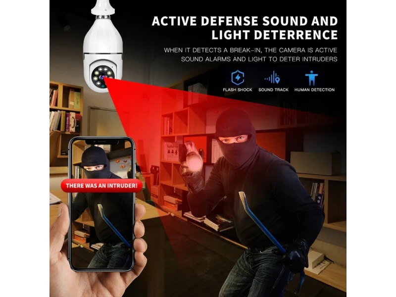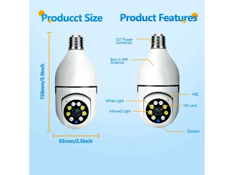 Cameră inovatoare tip dome cu bulb, cu unghi de vizualizare de 360° și microfon încorporat, ideală pentru supraveghere video ascunsă, acasă, la birou sau în spații comerciale. Camera tip dome cu bulb funcționează atât în modul zi, cât și în modul noapte, ceea ce o face... Un asistent indispensabil pentru control. Funcționează cu aplicația mobilă YI IoT potrivită pentru iPhone și Android. Camera dome de tip bec este extrem de ușor de instalat. Are un microfon și un difuzor încorporate de înaltă calitate pentru comunicare audio bidirecțională. Caracteristici: Pixeli: 2MP; Rezoluție: 1920x1080p; Funcție PTZ (mișcare); Cameră Wi-Fi (nu necesită cabluri); Audio bidirecțional (vă permite să vorbiți și să ascultați clar prin telefon); Alarmă (opțiune de alertă de mișcare); Notificări de trafic (pe dispozitivul mobil sau computerul desktop); Mod de lucru zi și noapte; Vedere nocturnă colorată; IR + Alb + Diode LED; Rezistent la praf și umezeală; Stocare în cloud; Aplicație: YI IoT; Interfață de alimentare: E27; Tensiune de alimentare: 220v-240v AC Setul include: 1 cameră; 1x dulie pentru bec E27; 1 x manual de utilizare în LIMBA BULGARĂ 1 x elemente de fixare.