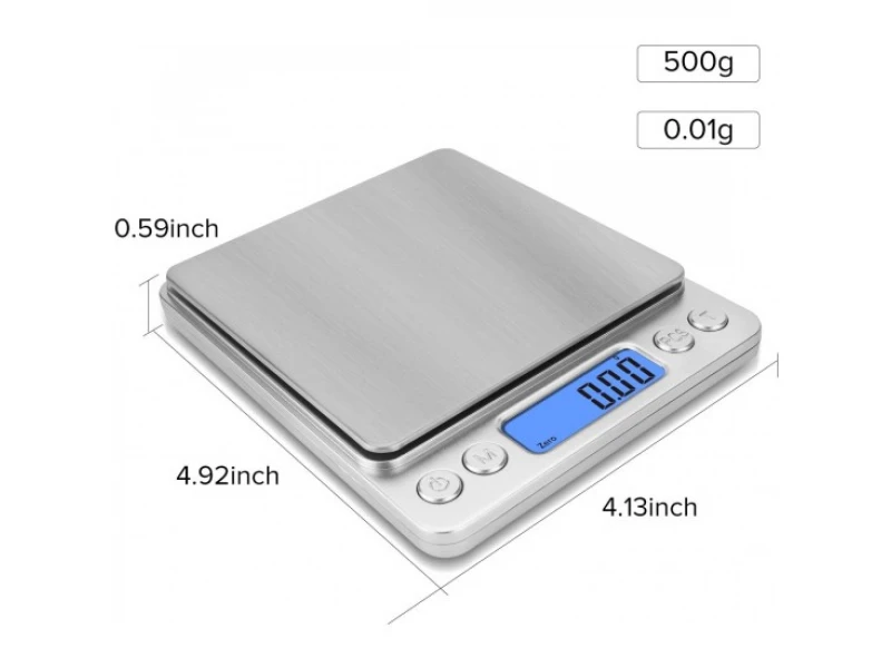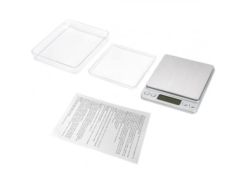 Cântar electronic de precizie pentru bijuterii, 500 de grame, cu precizie ridicată și ecran LCD cu iluminare de fundal albastră. Extrem de stabil în funcționare, cu repetabilitate a rezultatelor măsurătorilor. De asemenea, are funcție de tară (zero) și selectare a unităților de măsură. Funcționează cu 2 baterii AAA (incluse în set) și se oprește automat după 30 de secunde. Are un capac de protecție care servește și ca tavă pentru articolele măsurate. Capacitatea maximă a cântarului este de 500 g, cu o precizie de 0,01 g.