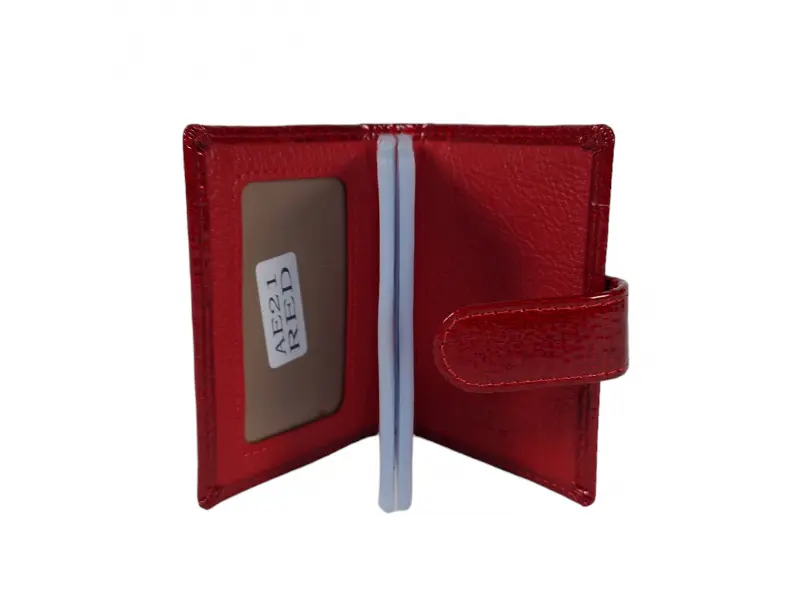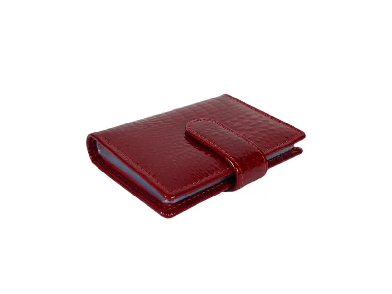 Carte de vizită din piele cu finisaj lac - Suport pentru cărți de vizită din piele naturală. - Închidere cu un buton de clic. - Multe sloturi pentru carduri și documente personale.