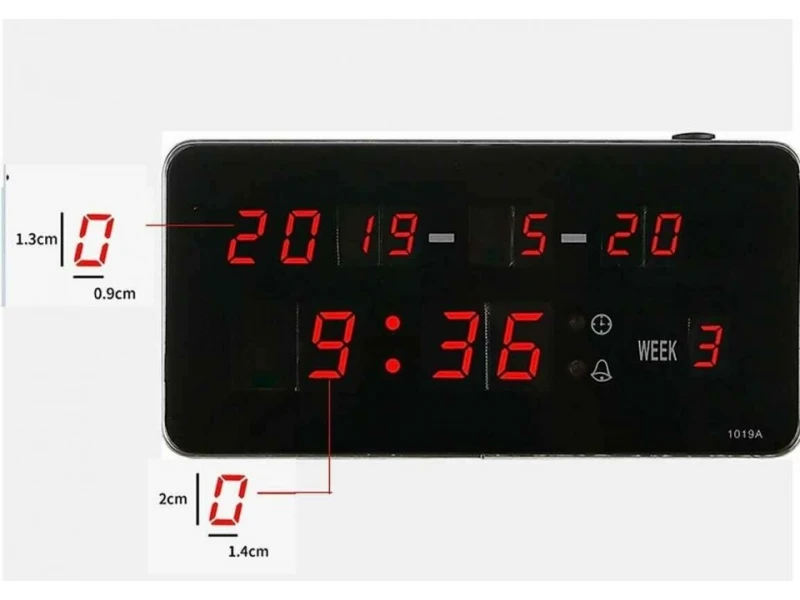 Ceas electronic de perete LED model 1019 cu cifre mari, cu posibilitatea de a: Seta: ora, data, luna, anul și 8 alarme, Citirea temperaturii ambientale
