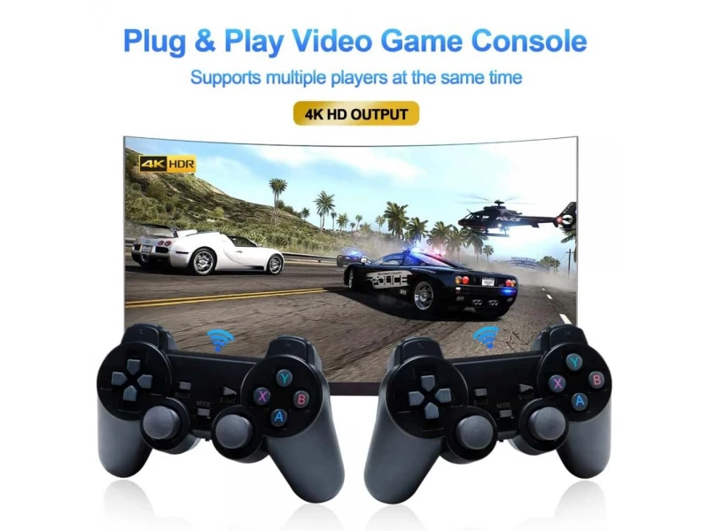 Consolă de jocuri portabilă wireless cu două controllere de 2,4 GHz, cadou ideal pentru copii și adulți. Peste 10.000 de jocuri clasice încorporate.