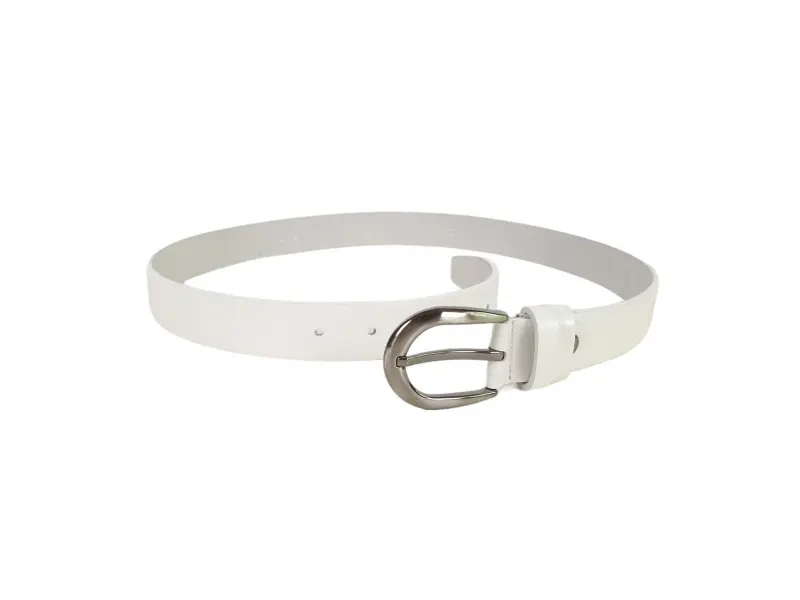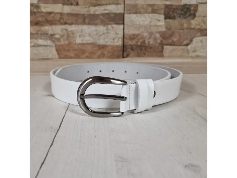 Curea confortabilă pentru femei, confecționată din piele naturală. Curea elegantă, potrivită pentru blugi și pantaloni, care poate fi scurtată cu ușurință. Curea albă cu cataramă metalică.
