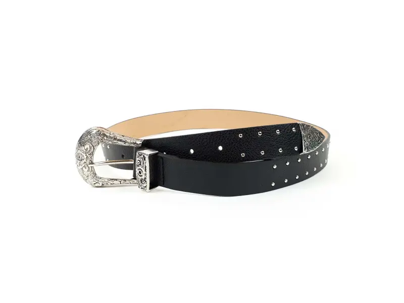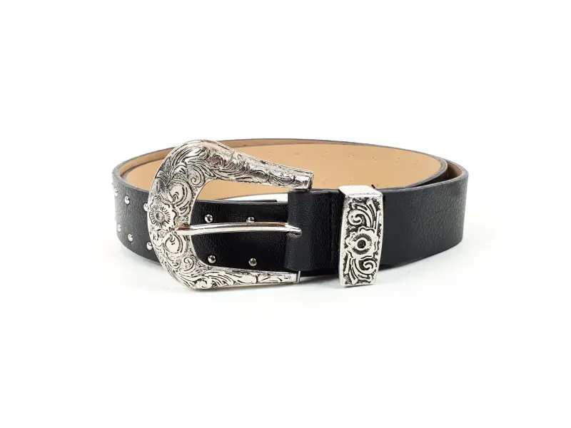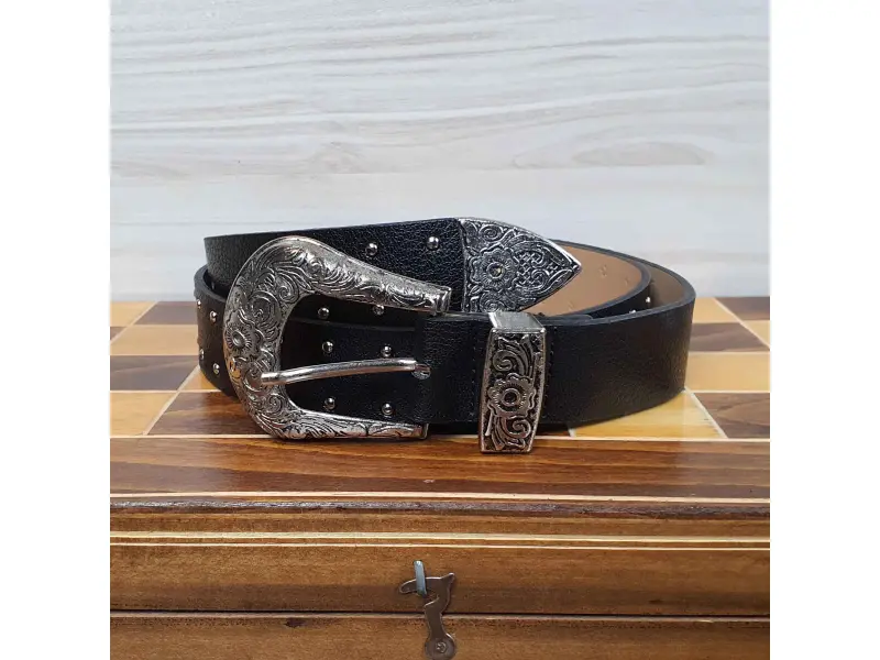 Curea de damă din piele artificială de culoare neagră. Curea de damă cu ochiuri și cataramă interesantă.