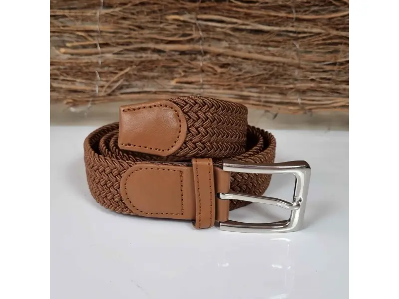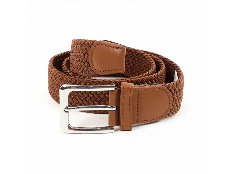 Curea elastică maro cu împletitură robustă și cataramă metalică. O curea potrivită atât pentru bărbați, cât și pentru femei, realizată cu o tehnologie specială ce nu permite întinderii mai mult decât este de așteptat. Avantajul este că se poate fixa pe întreaga lungime a curelei.