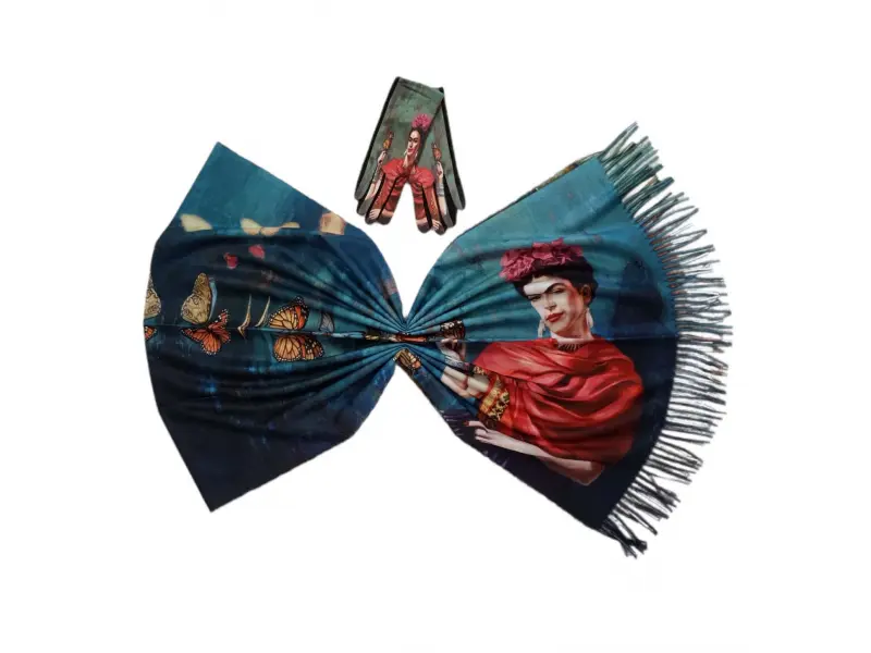 Set de eșarfă și mănuși de damă cu două fețe și imagini. Eșarfă moale și confortabilă, confecționată din 100% viscoză. Mănușile sunt de mărime universală, au elasticitate de la S la XL, cu degetul arătător puteți lucra pe telefon sau dispozitiv inteligent.