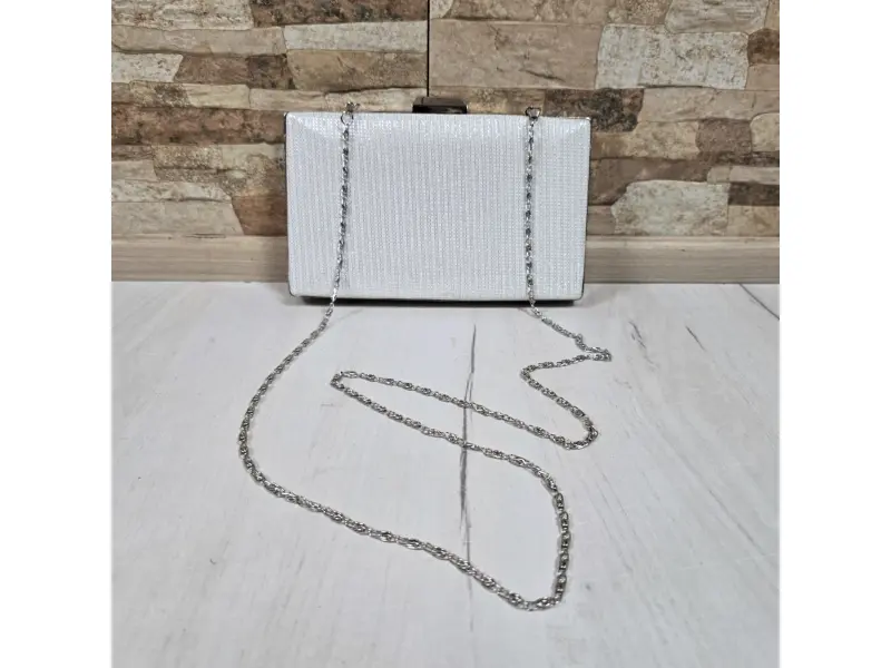 Geantă elegantă pentru un eveniment formal - bal de absolvire, nuntă. Geantă elegantă și frumoasă, de culoare albă, cu un compartiment, mecanism și mâner lung tip lanț.