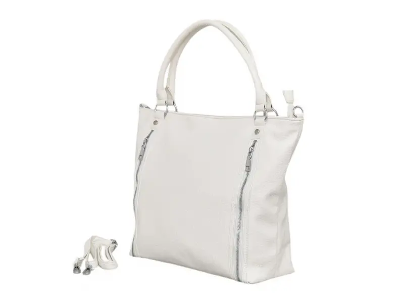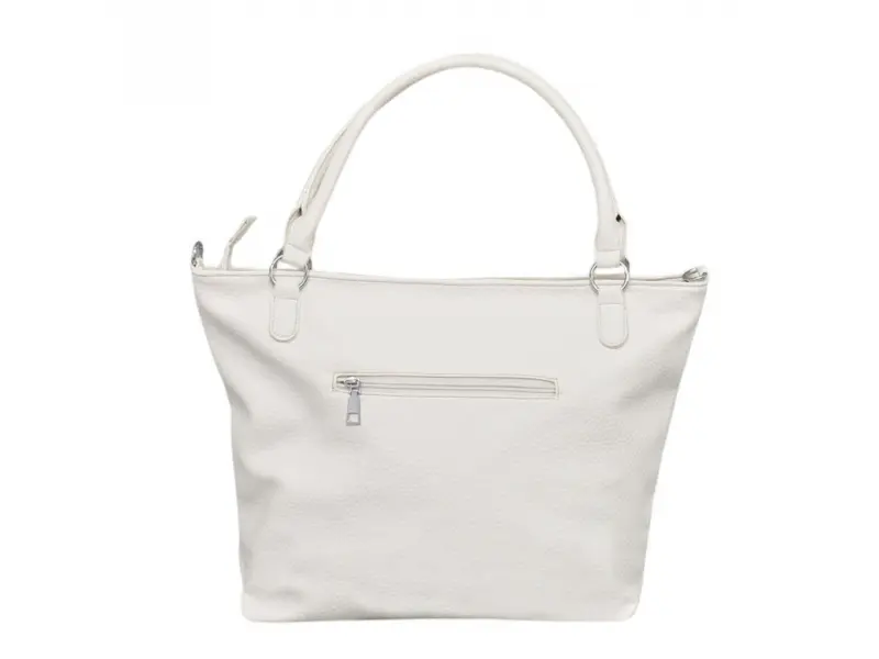 Geantă mare din piele artificială de calitate. Geantă de uz zilnic, cu compartimente practice și bretele confortabile. Geantă albă cu un design interesant.