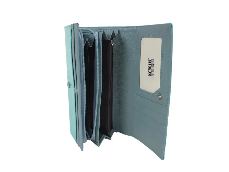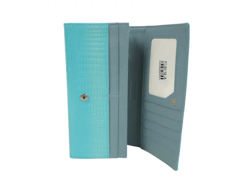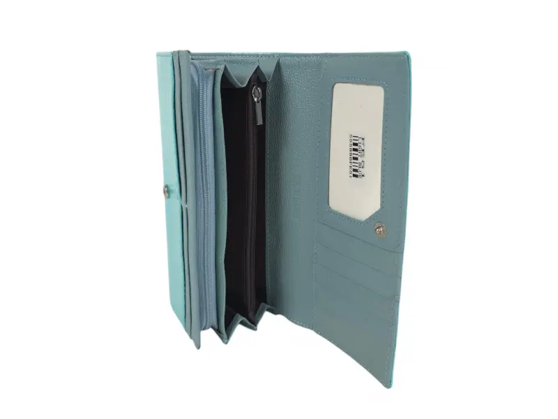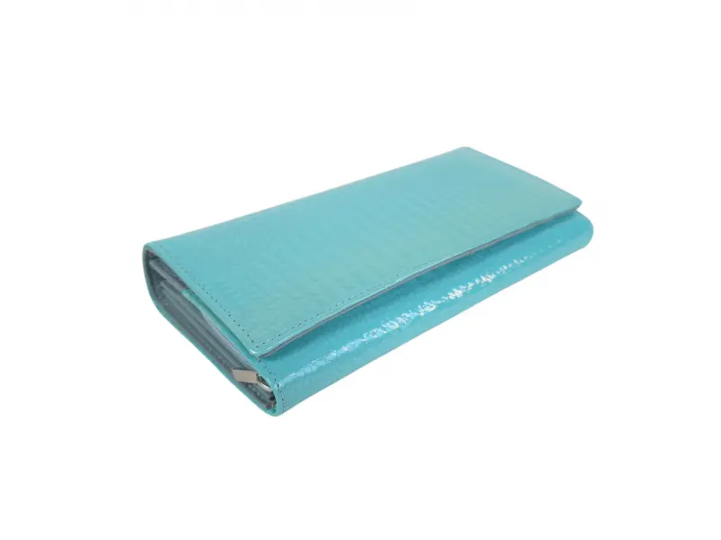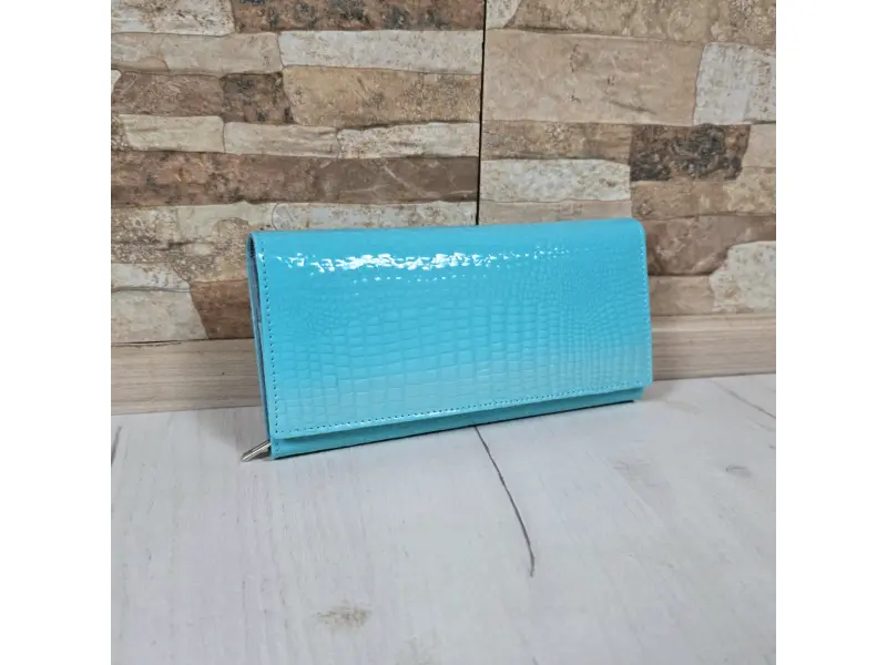 Portofel albastru de damă, confecționat din piele naturală și piele lăcuită. Portofel mare de damă, cu compartimente pentru bancnote, sloturi pentru carduri și documente personale și un portofel pentru monede cu fermoar. Portofel frumos de damă, cu un design interesant.