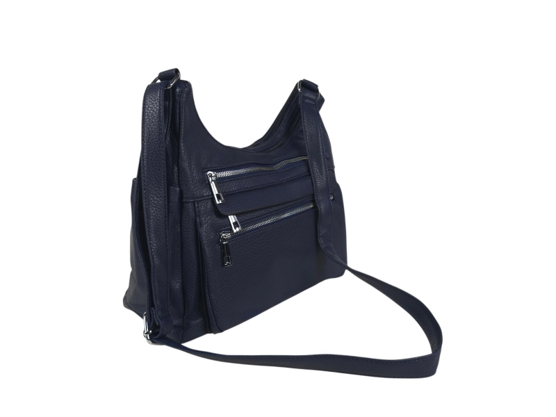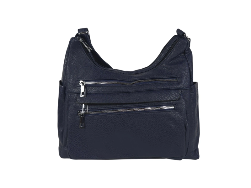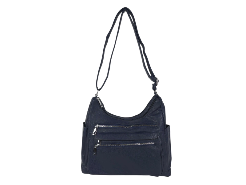 Geantă medie din piele ecologică de calitate. Geantă albastră cu multe compartimente și mâner lung reglabil. Geantă de zi cu zi cu un design interesant.