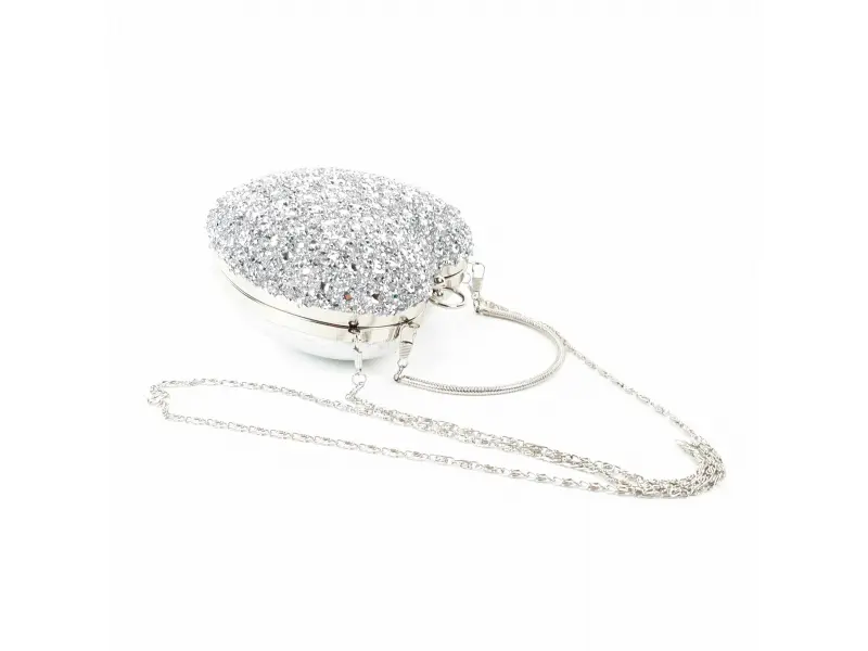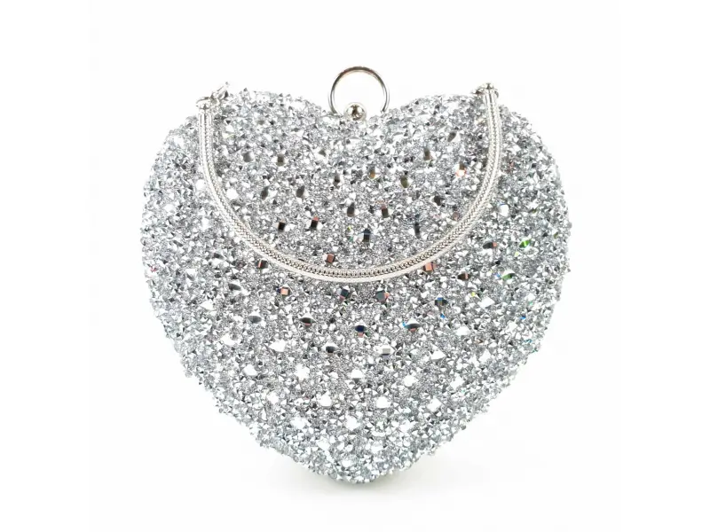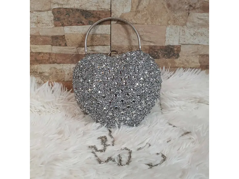 O geantă argintie strălucitoare în formă de inimă, cu un compartiment cu garnitură argintie, un mâner lung de tip lanț și o curea suplimentară de mână. O geantă potrivită pentru un bal de absolvire.