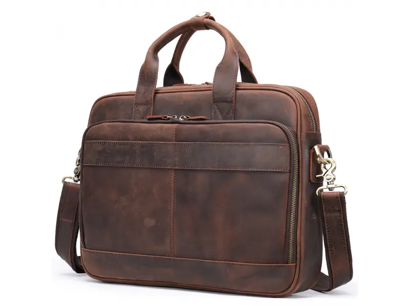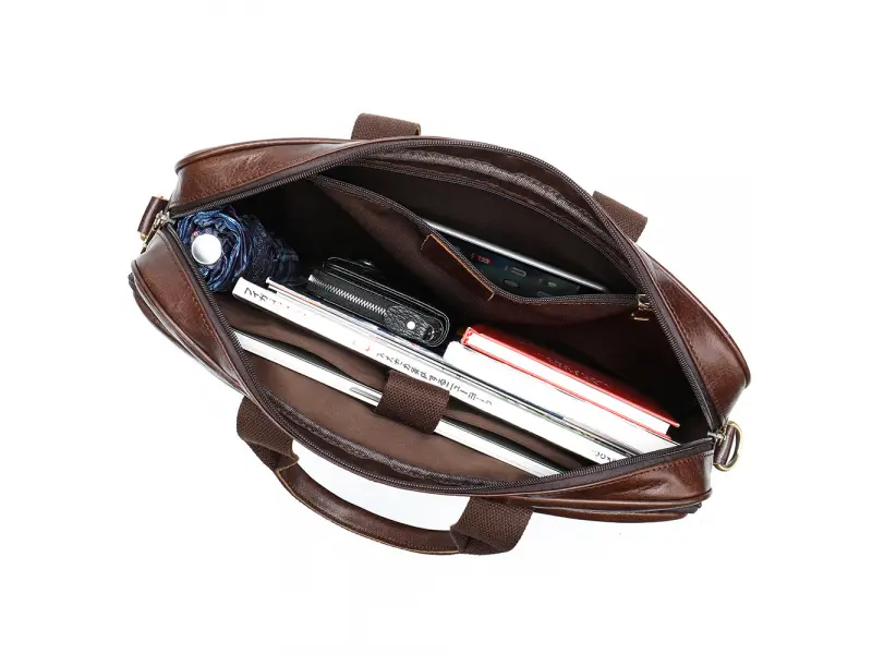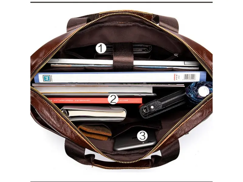 Geantă bărbătească din piele naturală tratată special - Un compartiment principal cu fermoar. - Compartiment pentru laptop cu închidere adezivă. - Buzunar interior cu fermoar. - Buzunar frontal cu fermoar. - Compartiment telefon. - Compartiment pentru pixuri și creioane. - Departamentul de documente. - Buzunar spate cu fermoar. - Mânere confortabile pentru transport. - Mâner lung reglabil.