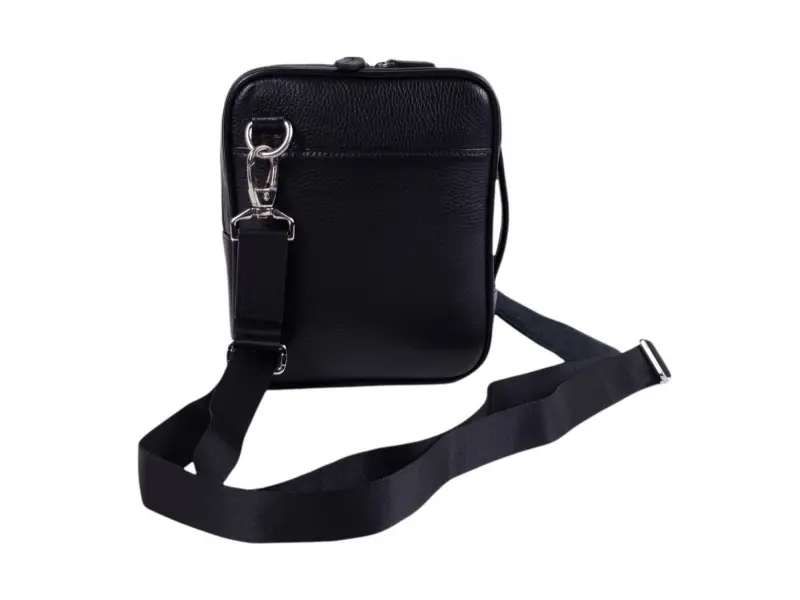 Geantă bărbătească din piele naturală de calitate, de culoare neagră. Geantă elegantă cu un compartiment principal cu fermoar, un buzunar interior mic cu fermoar, un buzunar frontal cu închidere magnetică. Geantă confortabilă cu mâner de mână și mâner lung reglabil.