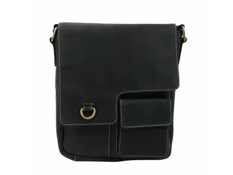 Geantă bărbătească de înaltă calitate, confecționată din piele naturală de vițel cu tratament special - Hunter. Geantă bărbătească neagră cu capac și închidere magnetică. Un compartiment principal cu fermoar, un buzunar interior cu fermoar, un loc pentru telefon și chei, un buzunar frontal cu fermoar, două compartimente frontale - unul cu închidere magnetică și un buzunar spate cu fermoar, un mâner reglabil din piele.