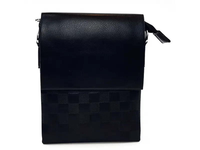 Geantă ecologică elegantă pentru bărbați, de culoare neagră, cu pătrate și mâner lung reglabil din poliester. Geantă bărbătească din piele ecologică, cu închidere magnetică, buzunar la spate și separatoare interne.