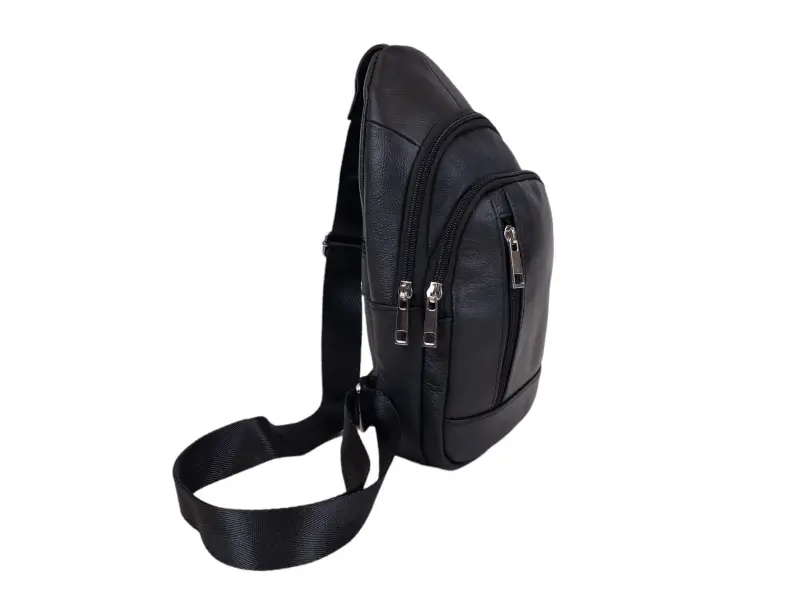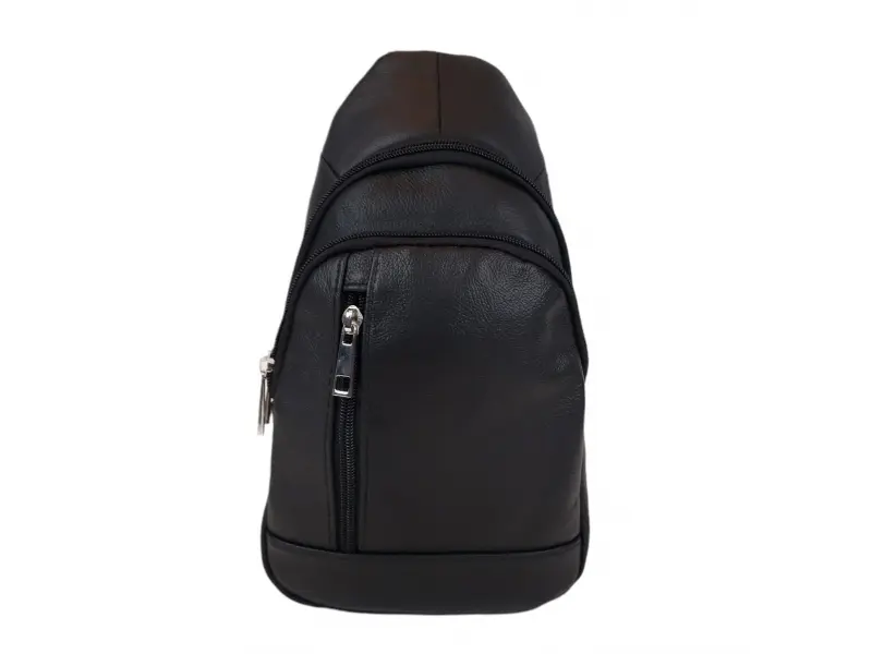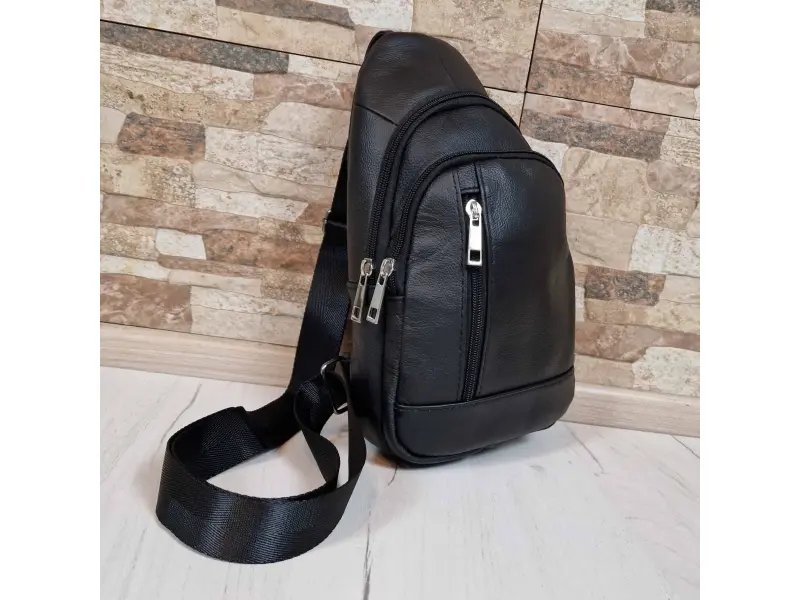 Geantă crossbody bărbătească din piele naturală. Geantă bărbătească neagră care poate fi purtată la piept, pe umăr sau la spate ca un rucsac. Geantă bărbătească cu un compartiment principal cu fermoar, un buzunar interior mic fără fermoar, două buzunare frontale cu fermoar, un buzunar spate cu fermoar, o curea de umăr reglabilă confortabilă.