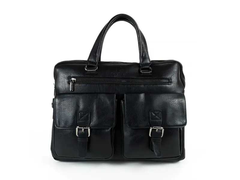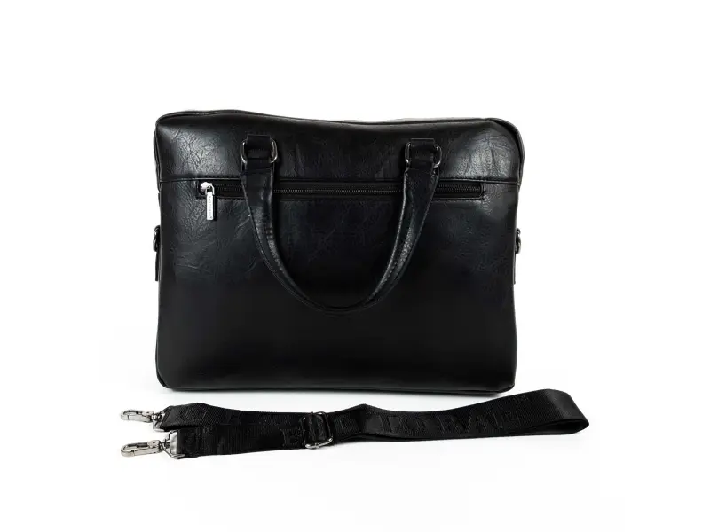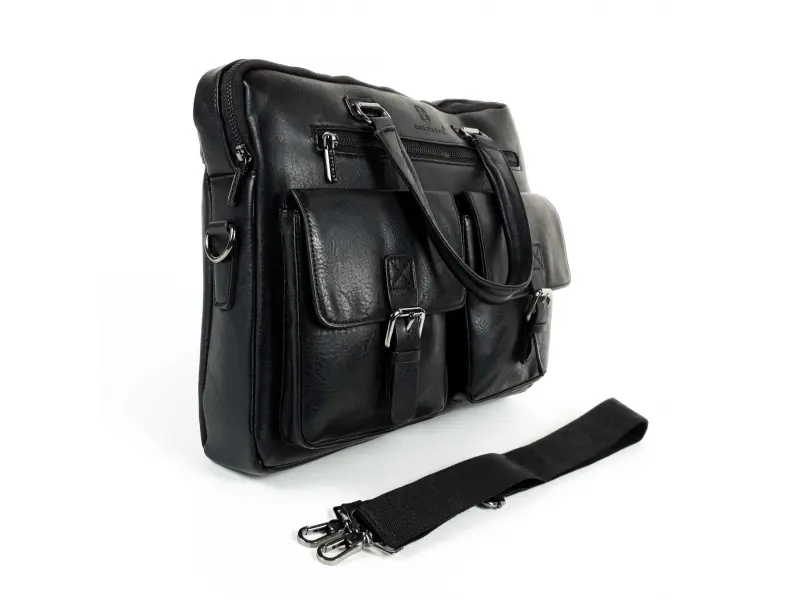 Geantă bărbătească mare, confecționată din piele ecologică de calitate, de culoare neagră. Geantă bărbătească cu un compartiment principal cu fermoar, un buzunar interior mic cu fermoar, un loc pentru telefon și documente, un compartiment pentru laptop, un buzunar spate cu fermoar, două buzunare frontale cu închidere magnetică și unul cu fermoar. Geantă cu un mâner lung, reglabil, confortabil, din material textil.