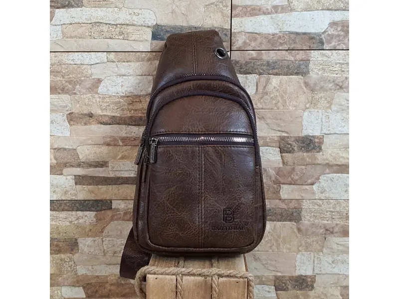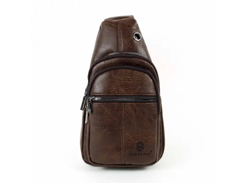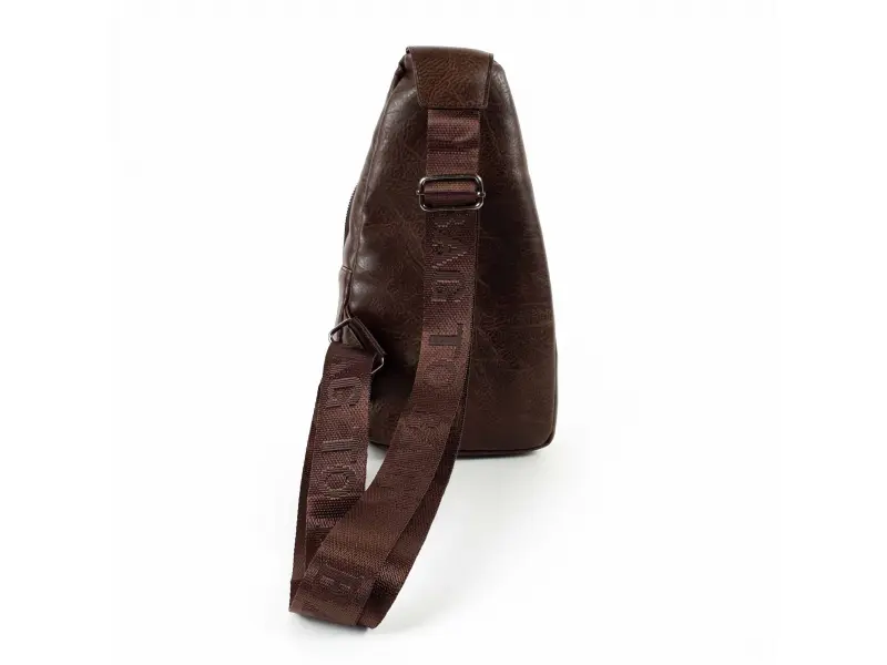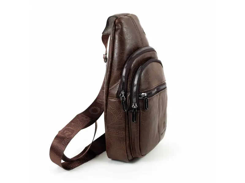 Geantă crossbody bărbătească, confecționată din piele ecologică de calitate. Geantă bărbătească maro închis, care poate fi purtată la piept, pe umăr sau la spate ca un rucsac. Geantă bărbătească cu două compartimente cu fermoar și un buzunar mic frontal cu fermoar.