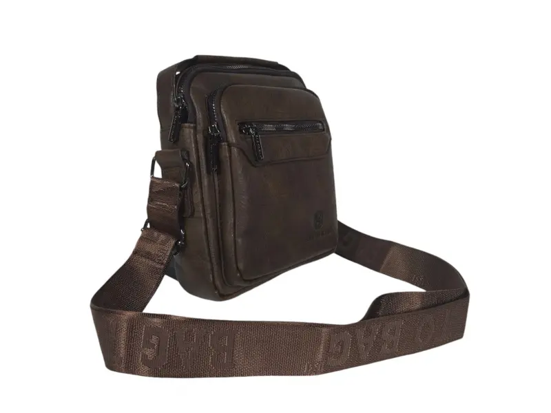 Geantă bărbătească robustă, confecționată din piele ecologică de calitate. Geantă elegantă cu multe compartimente și fermoare rezistente. Geantă bărbătească maro închis, cu mâner lung reglabil și mâner confortabil pentru purtare în mână.