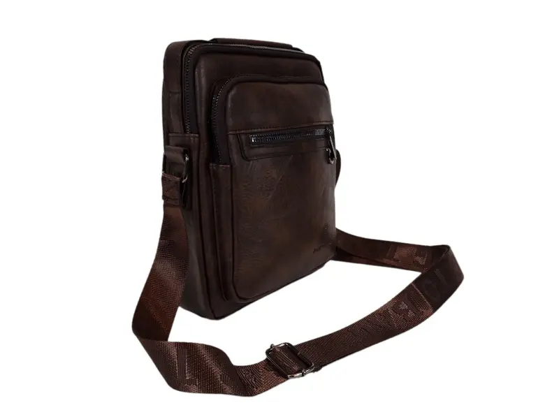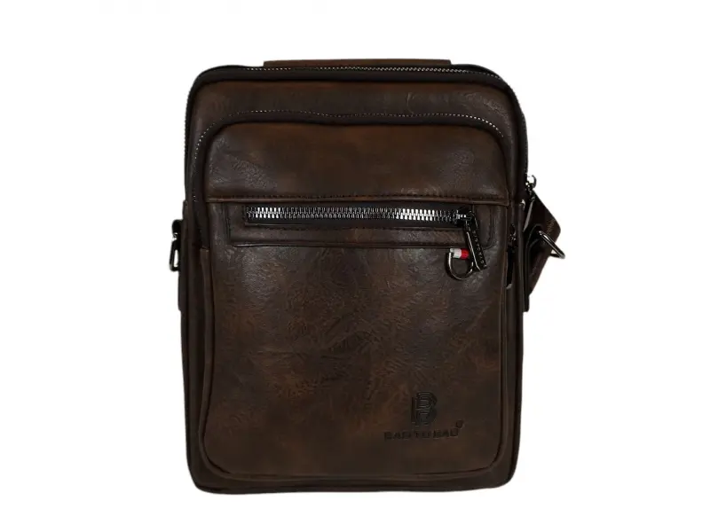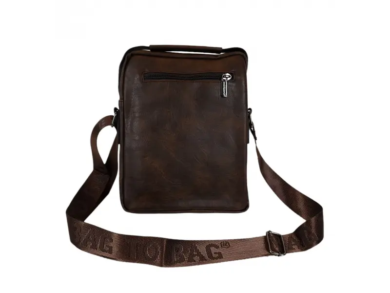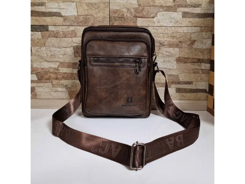 Geantă bărbătească din piele ecologică de calitate, de culoare maro închis. Geantă confortabilă cu un compartiment principal cu fermoar, un buzunar interior mic cu fermoar, două buzunare frontale cu fermoar și un buzunar spate cu fermoar. Geantă bărbătească robustă, cu mâner confortabil pentru purtare în mână și mâner lung reglabil.