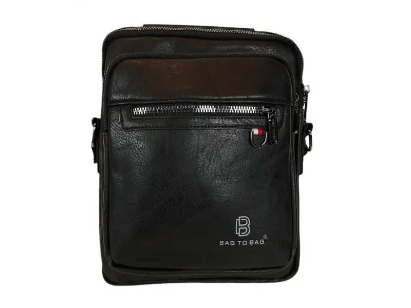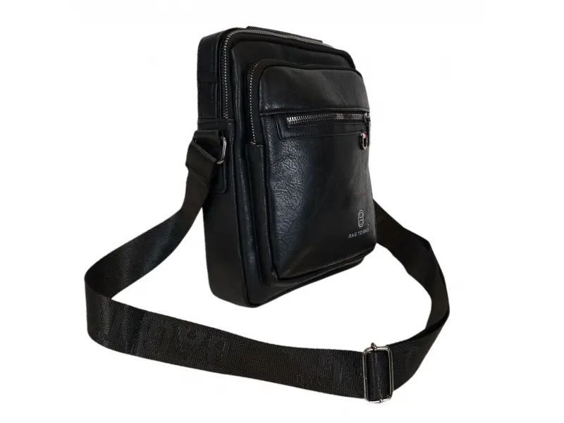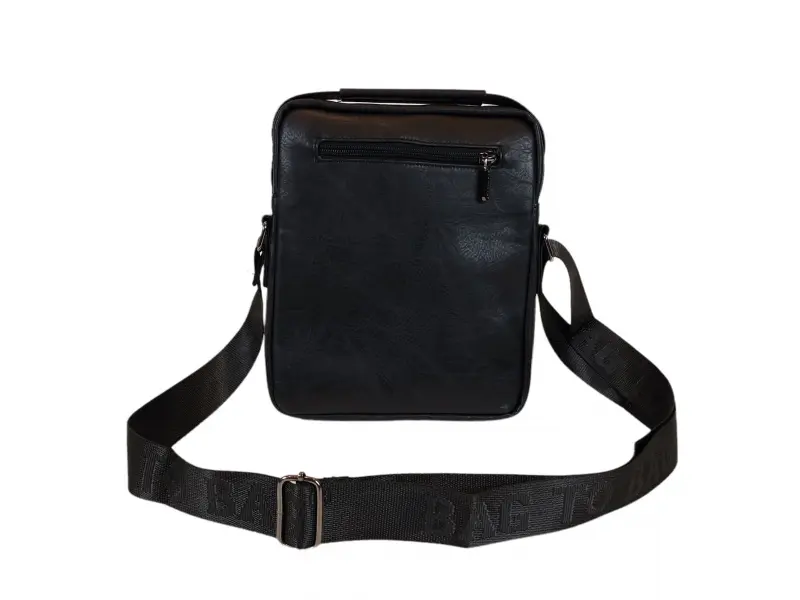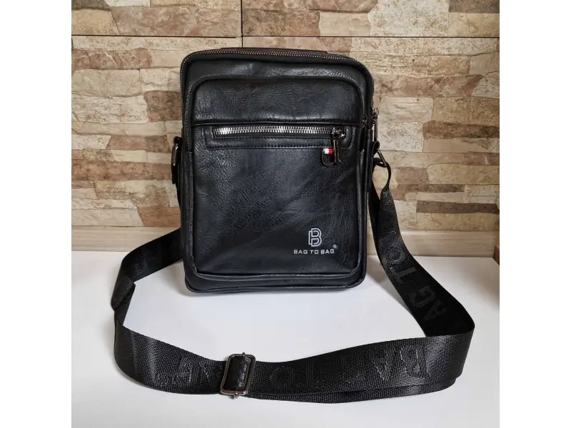 Geantă bărbătească din piele ecologică de calitate, de culoare neagră. Geantă confortabilă cu un compartiment principal cu fermoar, un buzunar interior mic cu fermoar, două buzunare frontale cu fermoar și un buzunar spate cu fermoar. Geantă bărbătească robustă, cu un mâner confortabil pentru purtare în mână și un mâner lung reglabil.