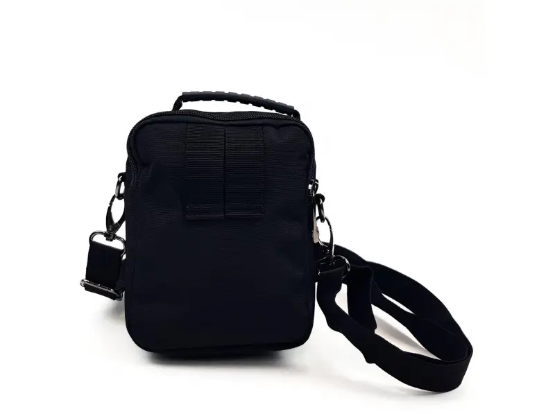 Geantă mică pentru bărbați, confecționată din material rezistent și fermoare de calitate. Geantă mică de culoare neagră cu multe buzunare închise cu fermoare de calitate, geantă sport pentru bărbați cu mâner lung din poliester și mâner mic de transport.