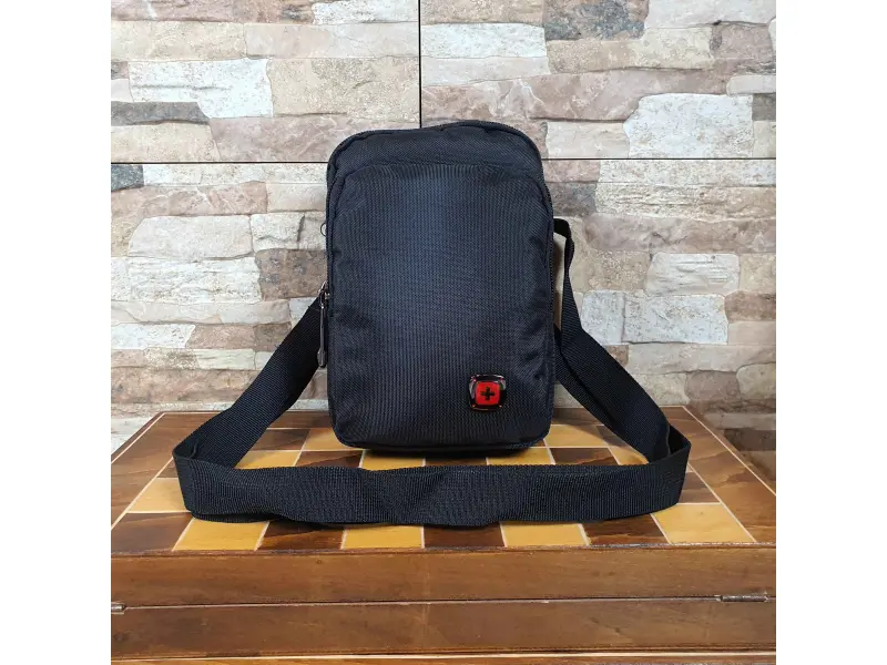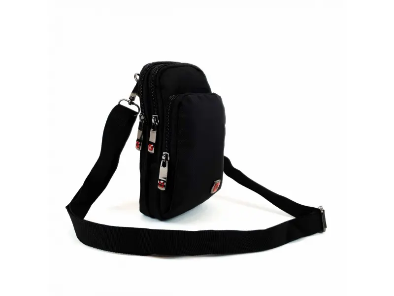 Geantă bărbătească din material rezistent, de culoare neagră. Geantă bărbătească de înaltă calitate, cu trei compartimente închise cu fermoare rezistente, un mâner lung reglabil și posibilitatea de a atașa o curea.