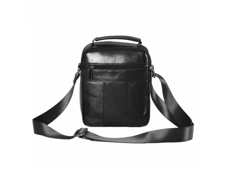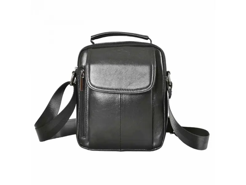 Geantă bărbătească din piele naturală - Două compartimente principale cu fermoar. - Buzunar interior mic cu fermoar. - Buzunar frontal cu fermoar. - Buzunar frontal cu clapă. - Buzunar spate cu fermoar. - Curea de umăr reglabilă. - Mâner pentru transport în mână.