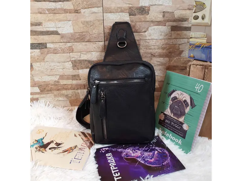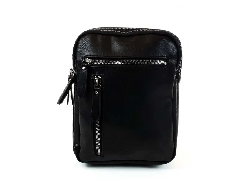 Geantă crossbody bărbătească, confecționată din piele ecologică de calitate. Geantă bărbătească neagră, care poate fi purtată la piept, pe umăr sau la spate ca un rucsac. Geantă bărbătească cu două compartimente mari și două buzunare frontale, închisă cu un fermoar argintiu spectaculos.
