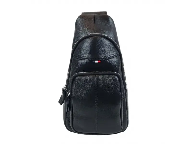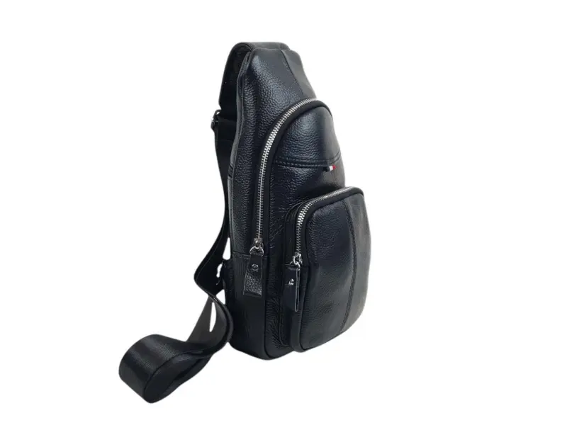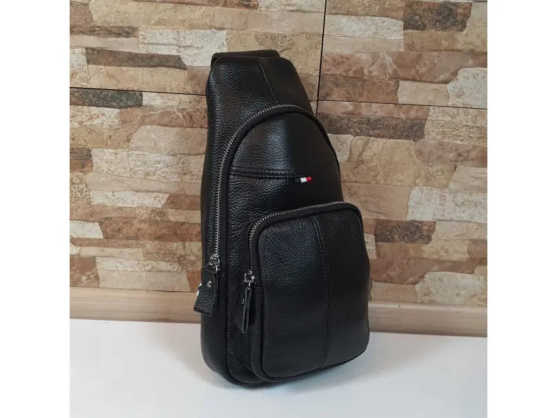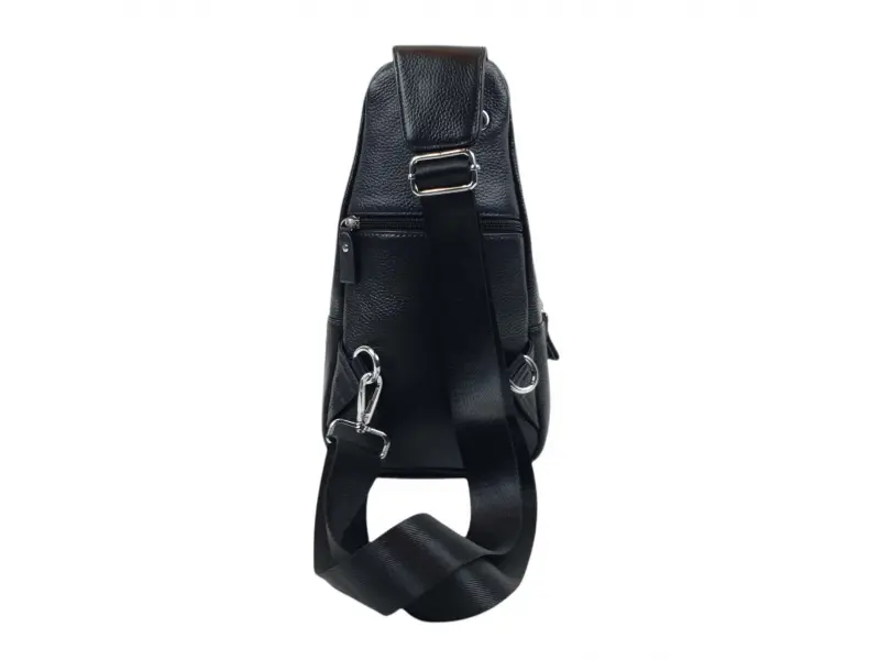 Geantă crossbody bărbătească din piele naturală. Geantă bărbătească neagră care poate fi purtată la piept, pe umăr sau pe spate ca un rucsac. Geantă bărbătească cu un compartiment principal cu fermoar, un buzunar interior mic cu fermoar, un compartiment pentru telefon sau documente, un buzunar frontal și unul posterior cu fermoar, o curea de umăr reglabilă confortabilă.