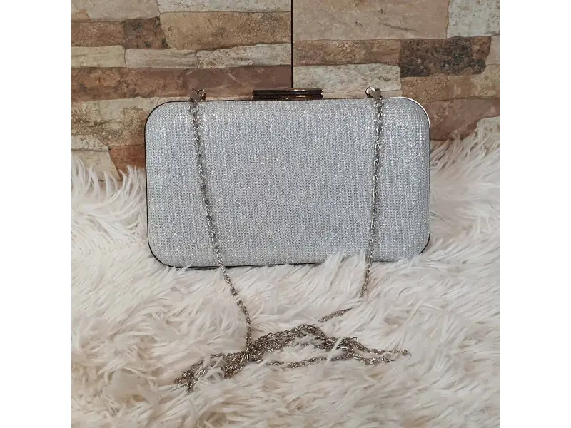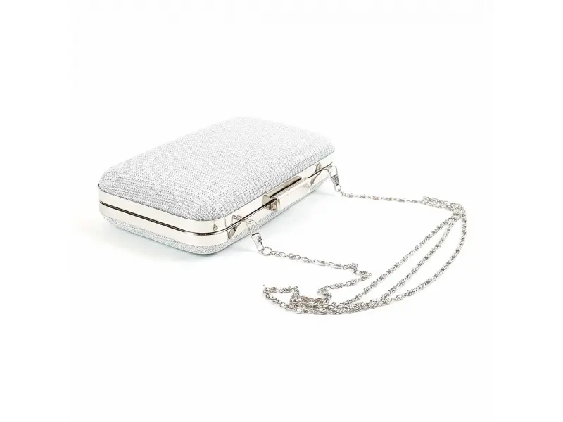 Geantă mică, elegantă, argintie, cu finisaje și lanț argintii, un compartiment cu deschidere mecanică. Geantă mică, argintie, potrivită pentru o geantă formală, pentru nunți, o geantă de seară sau o geantă de bal.