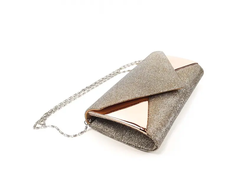 Geantă mică și elegantă, potrivită pentru bal, seri formale sau pur și simplu ca geantă de seară. Geantă tip clutch aurie, geantă de seară cu un lanț lung de argint și un compartiment mare.