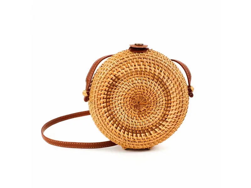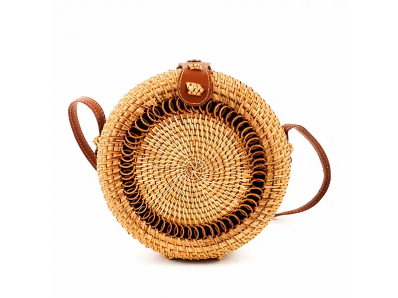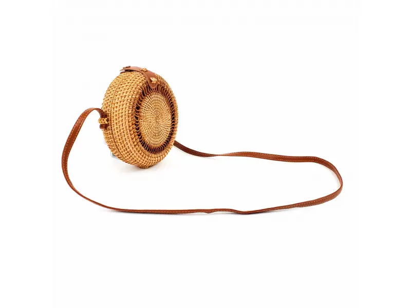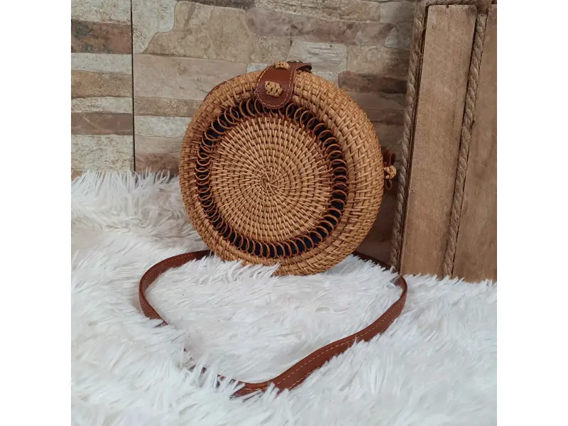 Un model interesant de geantă rotundă. Geantă de mână din ratan lucrată manual, cu un compartiment mare care se închide cu nasture și un mâner lung din piele ecologică maro.
