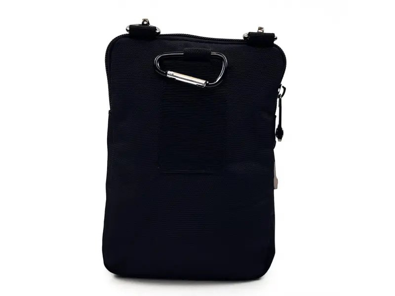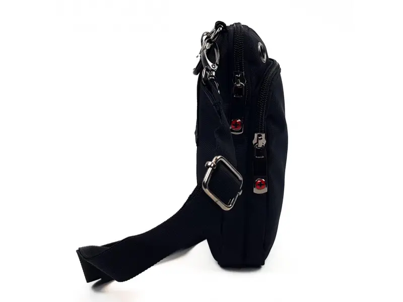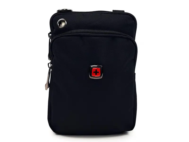 Geantă bărbătească neagră, confecționată din material rezistent și fermoare rezistente, cu curea de umăr reglabilă și posibilitatea de a atașa o curea. Geantă bărbătească mică, sport - elegantă.