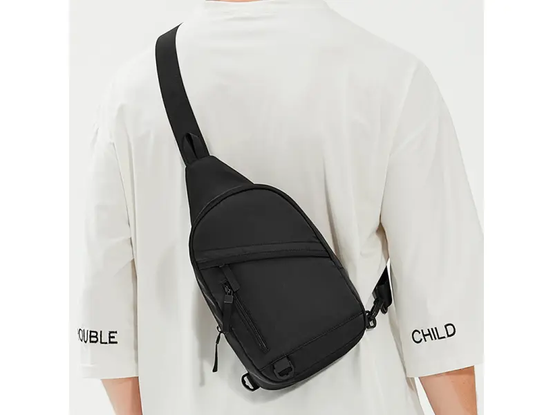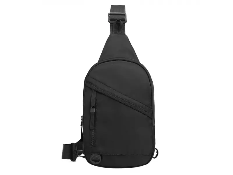 Geantă sport de piept pentru bărbați - O geantă bărbătească ce poate fi purtată pe piept, pe umăr sau pe spate, ca un rucsac. - Un compartiment principal cu fermoar. - Buzunar frontal cu fermoar. - Buzunar frontal fără fermoar. - Buzunar la spate fără fermoar. - Curea de umăr reglabilă. - Posibilitatea de a schimba direcția de purtare.