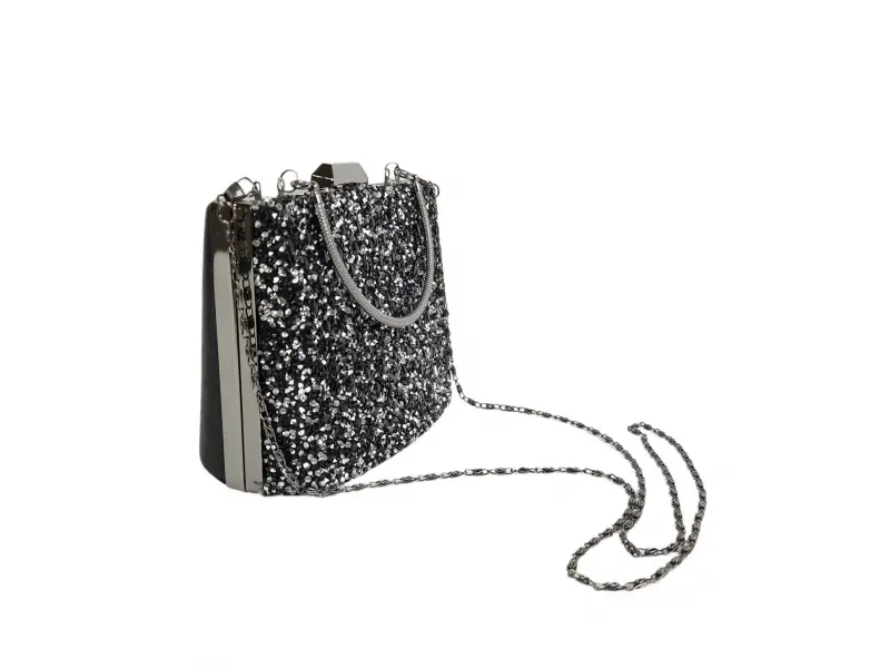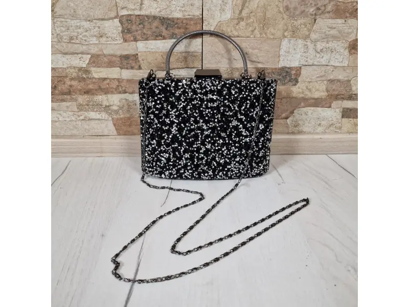 Geantă frumoasă pentru bal - Geantă de mână formală cu un singur compartiment. - Deschidere și închidere cu mecanism. - Margini metalice. - Mâner pentru transport în mână. - Mâner lung de tip lanț.